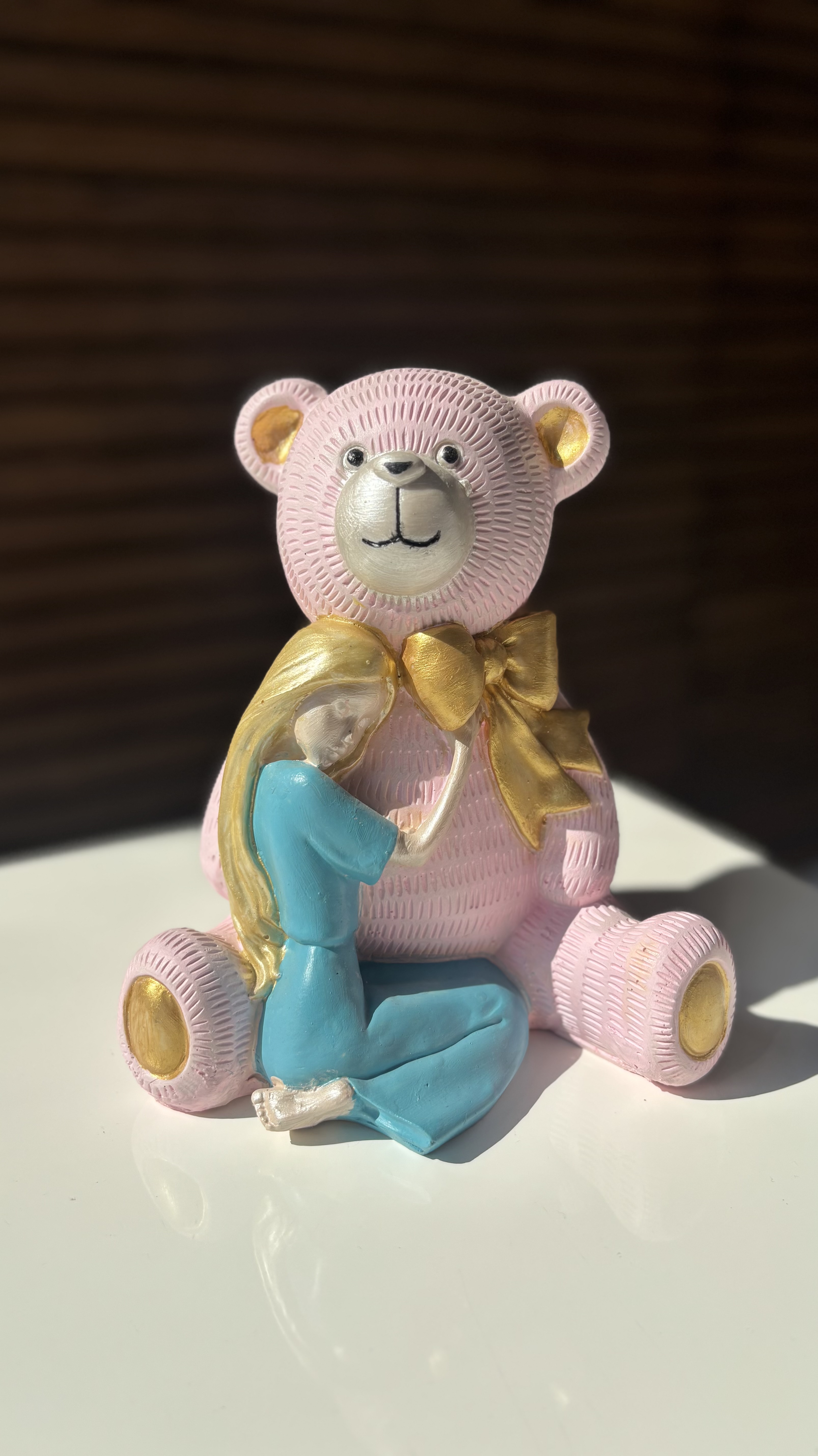 مجسمه خرس صورتی و دختر مو طلایی